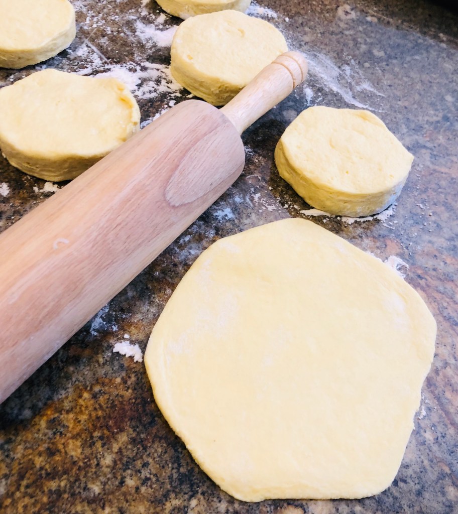 Fourth step: Using a lightly floured surface and a rolling pin, roll out a biscuit enough to cover the top of the ramekin. Continue to do this for all eight biscuits.