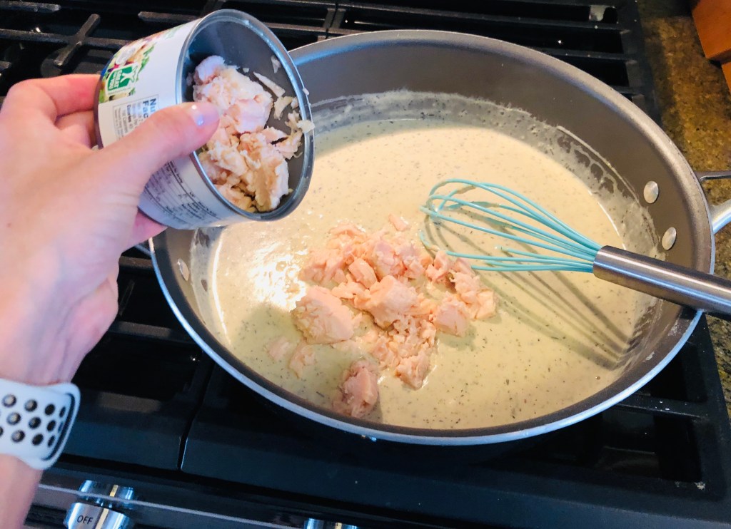 The first step: Using a large pan on the stove; Add the fat free half and half, chicken bone broth, seasonings and flour. Stir occasionally until you bring it to a boil. Turn down the heat, and simmer for about three minutes while you continuously stir. Then turn the heat off, set aside and cover to keep warm.