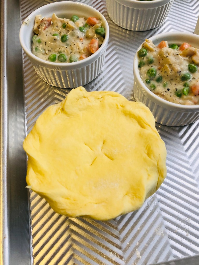 Fifth step: Cover each ramekin with a rolled-out biscuit, ensuring that you pinch down the sides of the biscuit around the top of the ramekins.