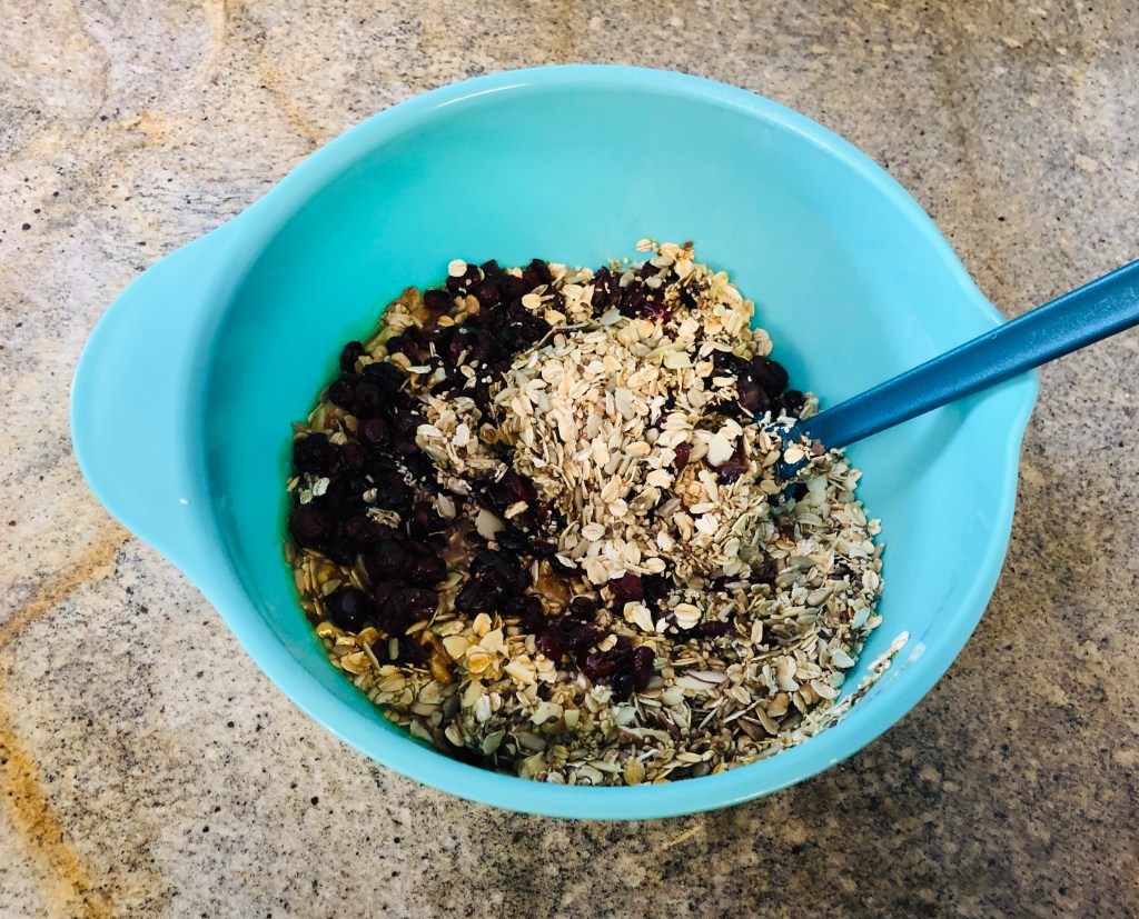 Step 5: In a large mixing bowl, combine your toasted oat mixture, dried fruit, and Agave. Stir well to coat evenly.