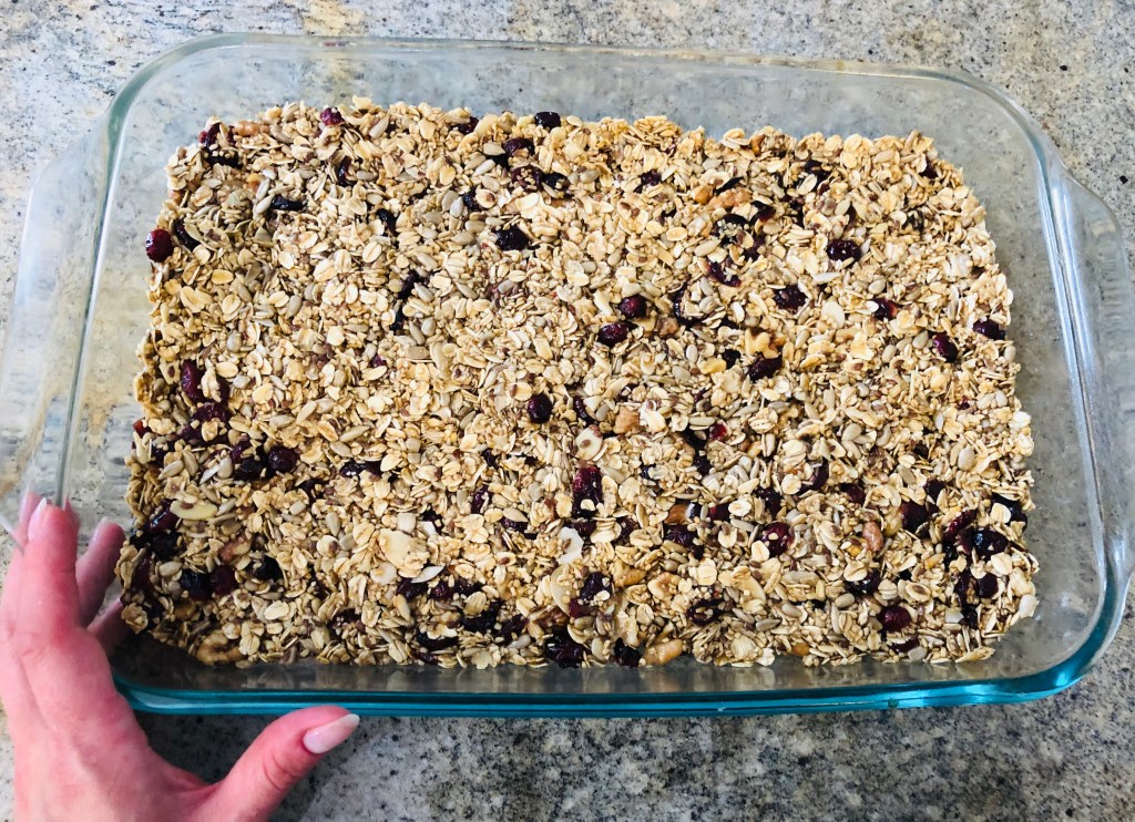 Step 6: Using a wooden spoon (Or your hand- just make sure it is moist otherwise the oats will stick to your hand), press mixture into prepared pan. Allow it to cool for 2-3 hours.