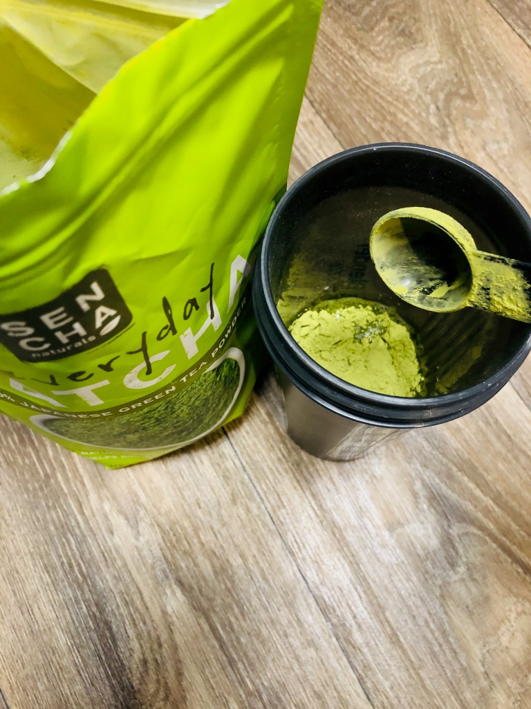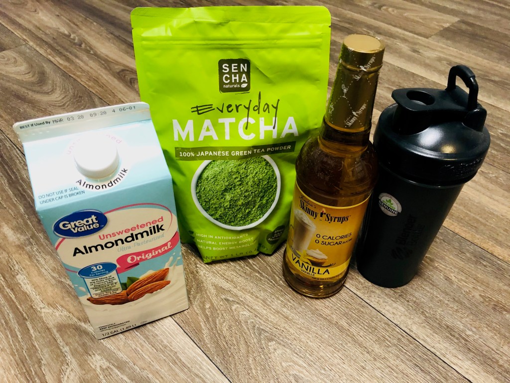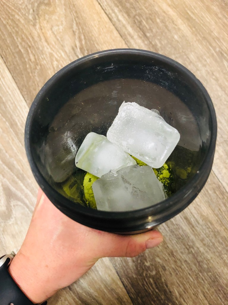 Step 2: Add 2 t Matcha Green Tea Powder, the sugar free vanilla and ice cubes. Place the lid back on your shaker/ blender bottle tightly and shake away!