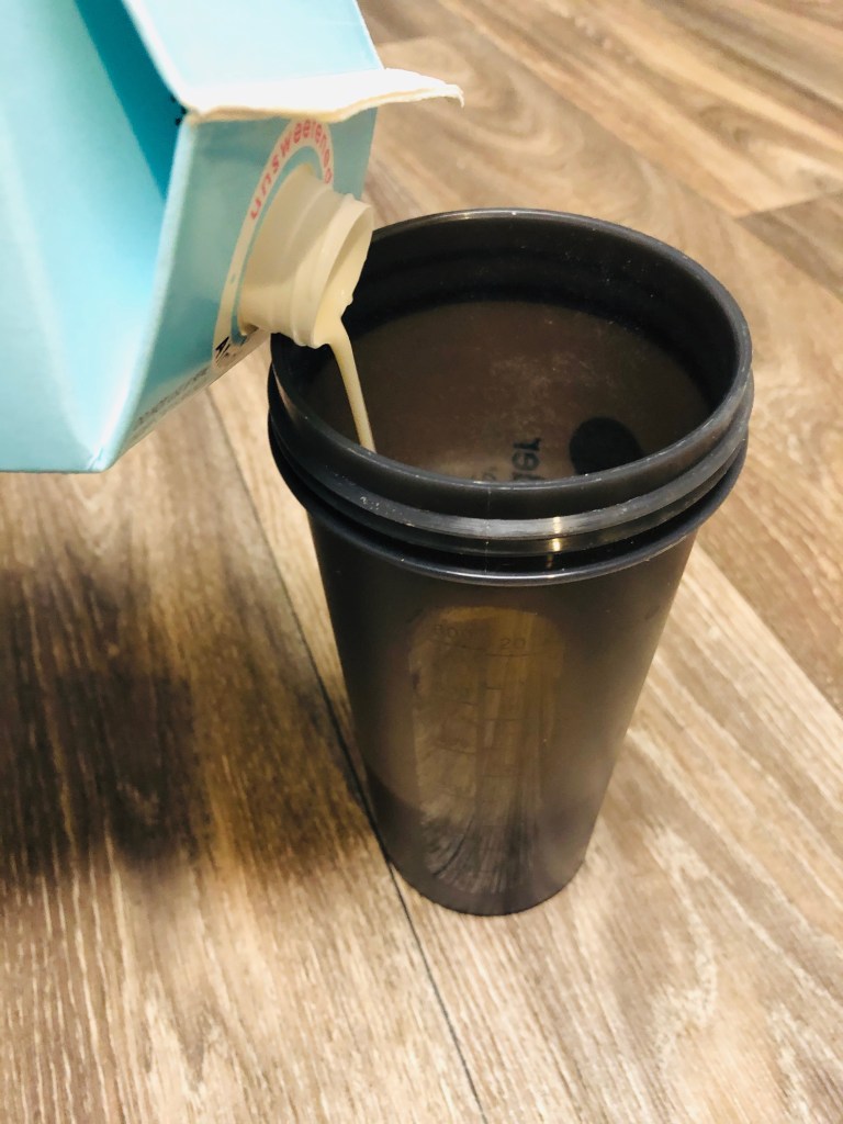 Step 1: Take your shaker/ blender bottle and add 1 C Unsweetened Vanilla Almond Milk.