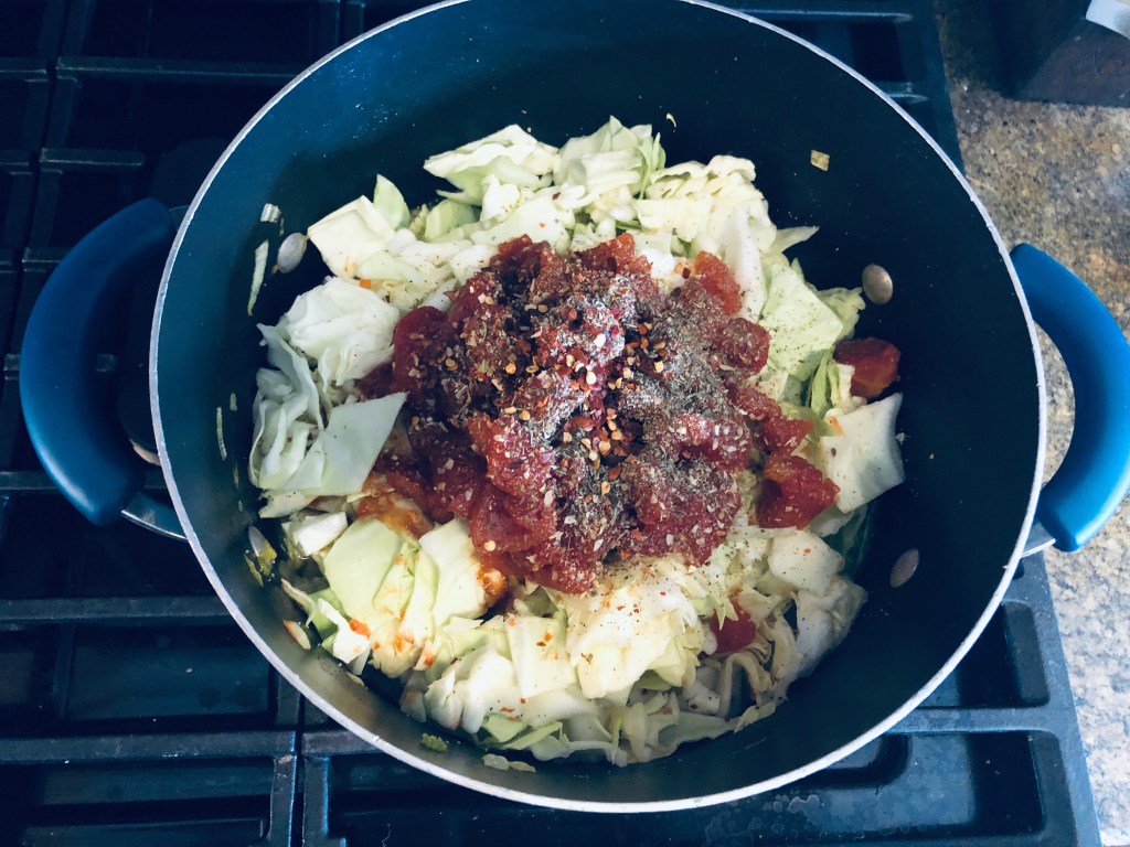 Step 2: Add the chicken broth, water, diced tomatoes, cabbage and spices.