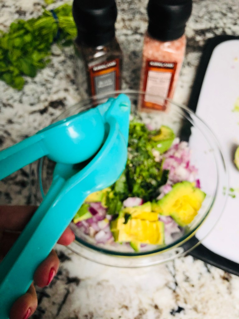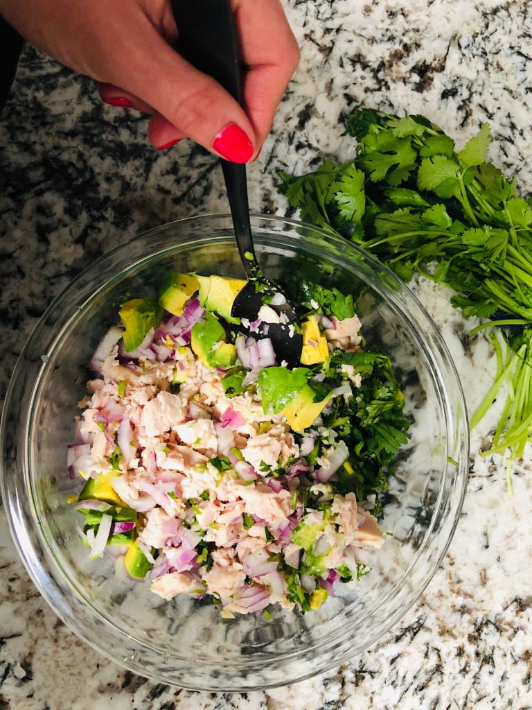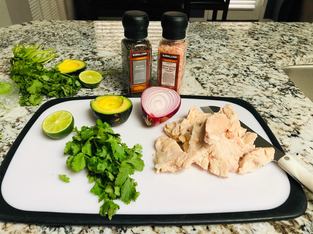 Step 1: In a large bowl, add the chopped chicken breast, avocado, lime juice, red onion, cilantro and salt and pepper to taste. Mix well.