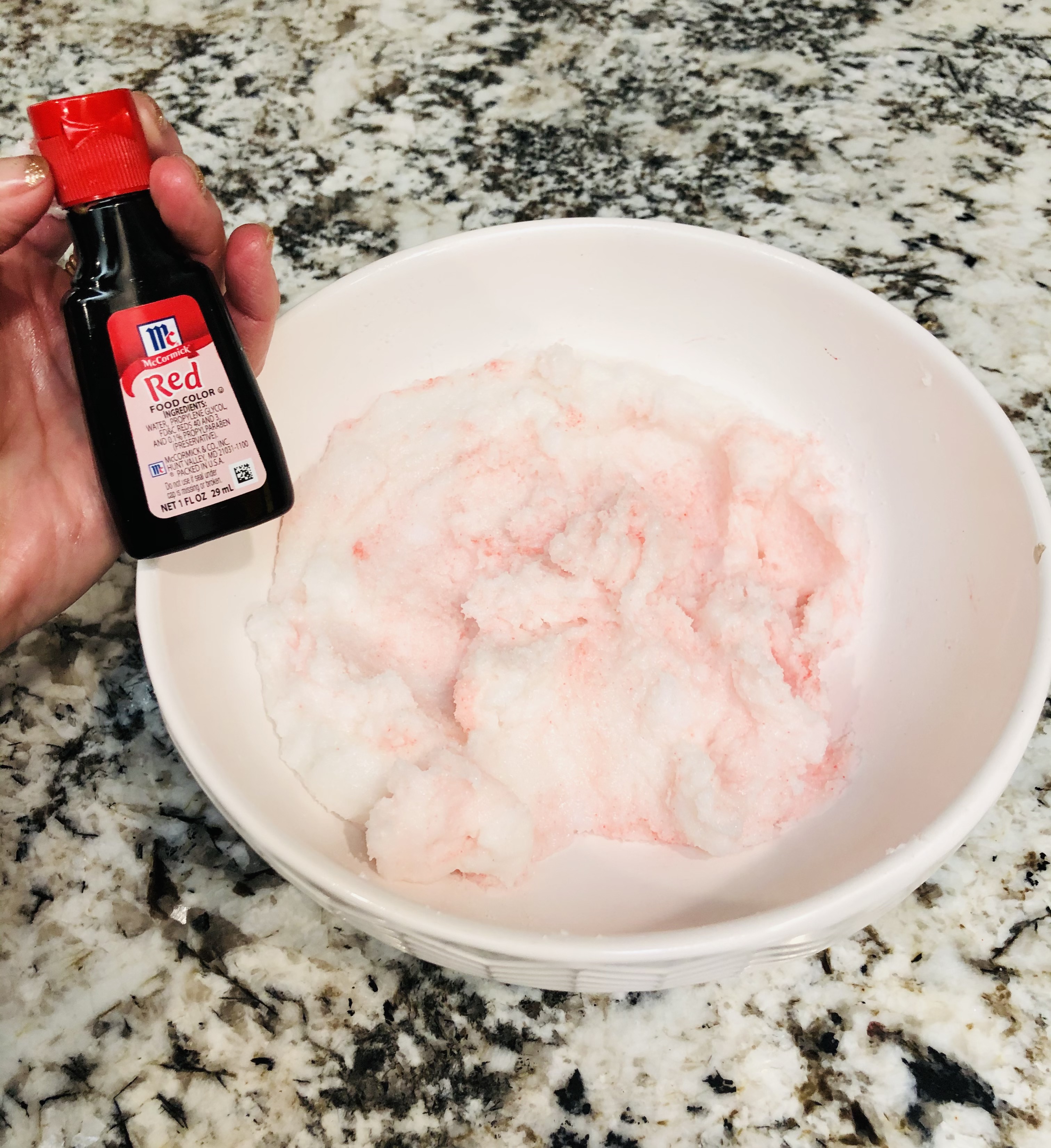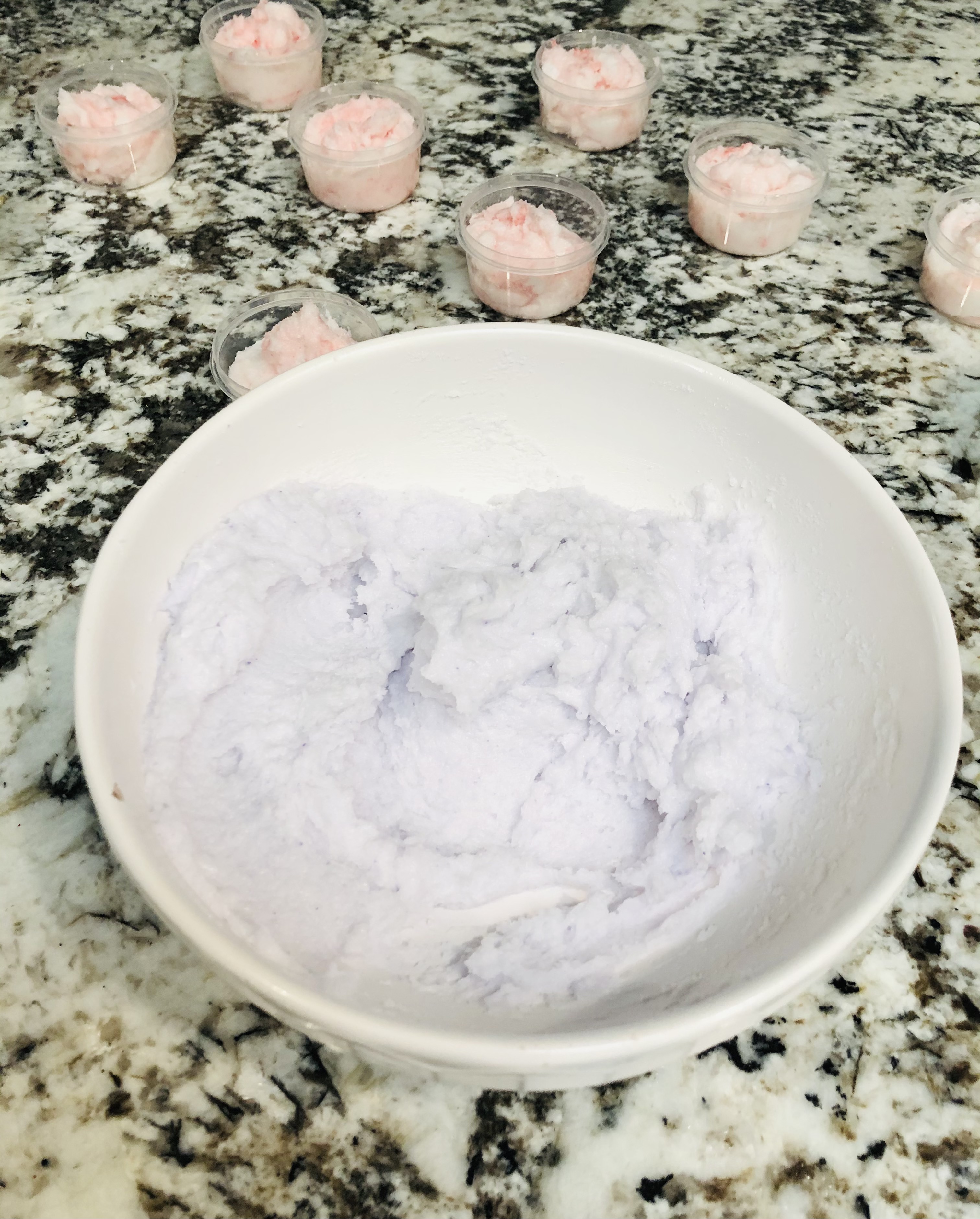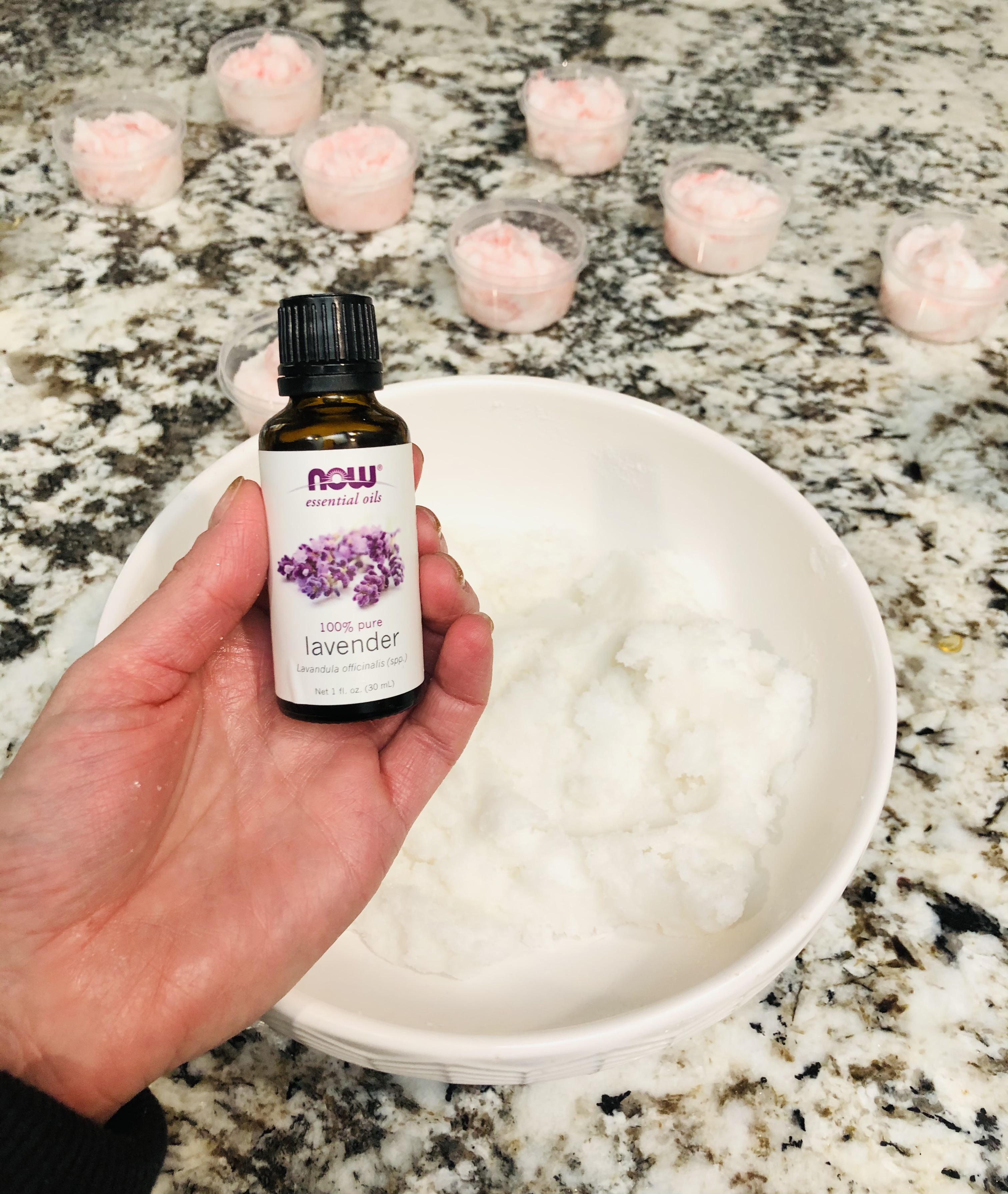 In a mixing bowl, add the sugar, coconut oil, 10 drops essential oil, vitamin E oil from the tablets (using a scissor to cut them open and squeeze into the mixture) and coloring if desired. (I made two batches; Peppermint and Lavender).