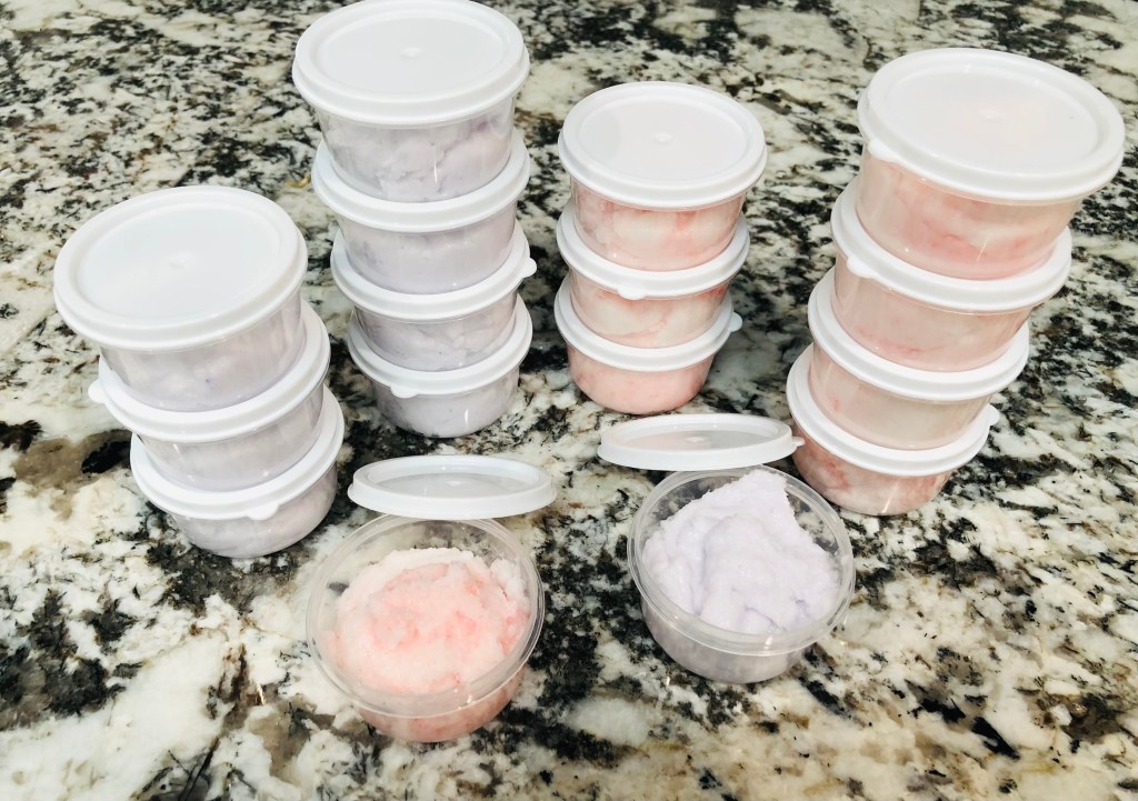 Now that your sugar scrub is mixed and ready, you can dispense it into containers of your choice. I used 2 rounded tablespoons per container and a single batch will yeild approx. 8 x 2 oz containers.