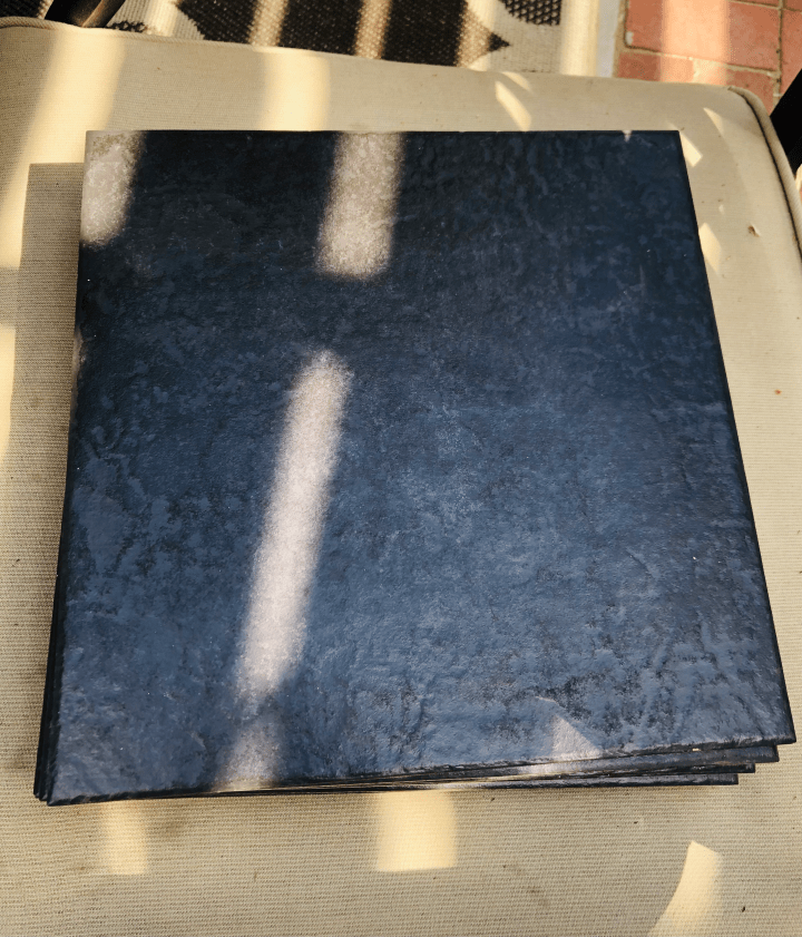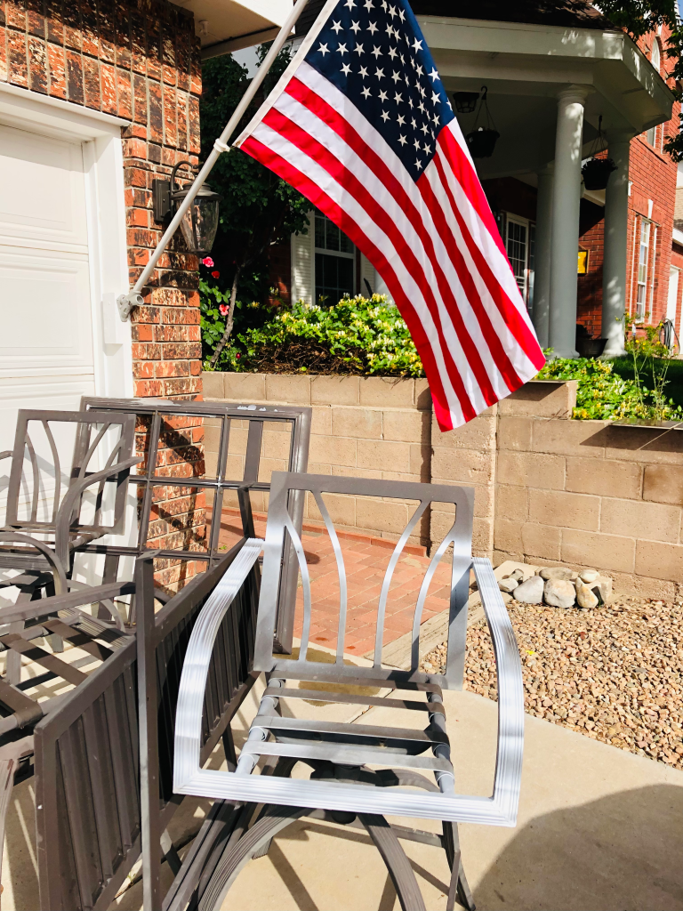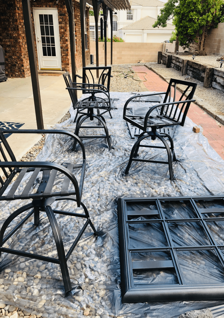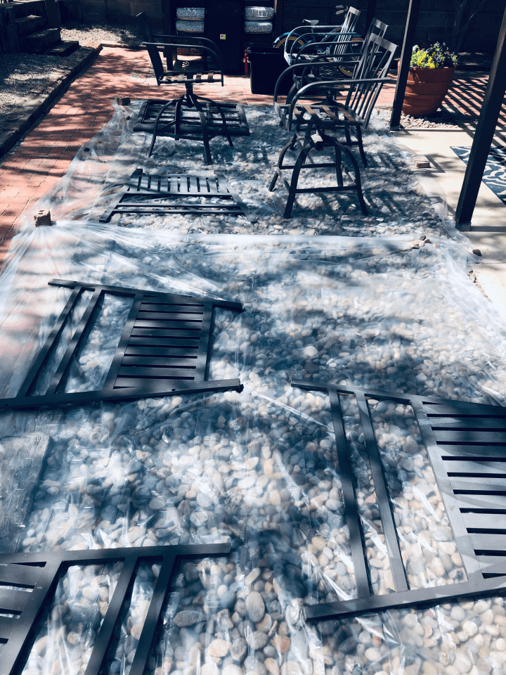 Step 1: The first thing you want to do is clean the items. We used our power washer to clean these pieces. As you can see, some of the chairs were covered in over-spray from a painting project the neighbor had completed, so it was important to inspect everything really well to ensure everything was very clean. Some things wouldn’t come off, so use used a little sand paper (Nothing too gritty) to gently sand off the unknown. This table also has a porcelain tile top, so we had to carefully clean each tile by hand. After we completed this step, we let them thoroughly dry in the sun.